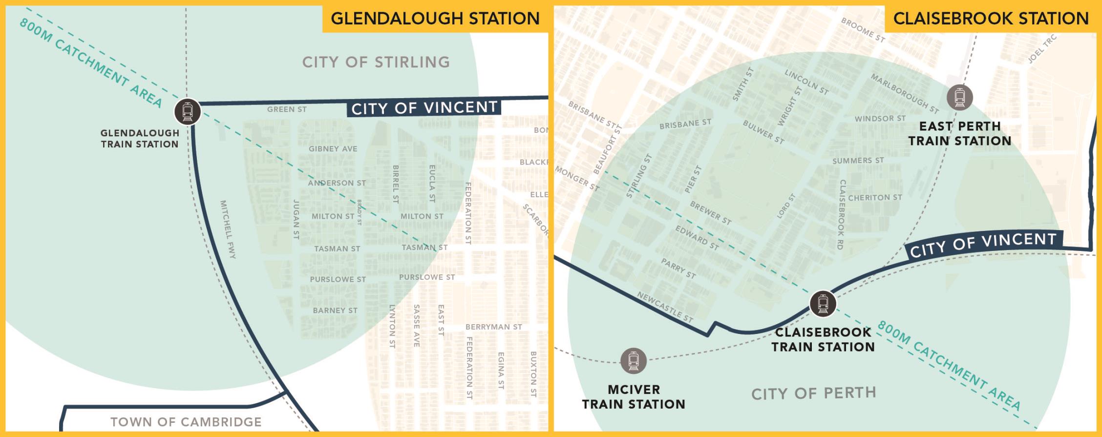 The announcement includes Claisebrook and Glendalough Train Stations. The 800-metre catchments for these stations will partially include land within the City of Vincent.